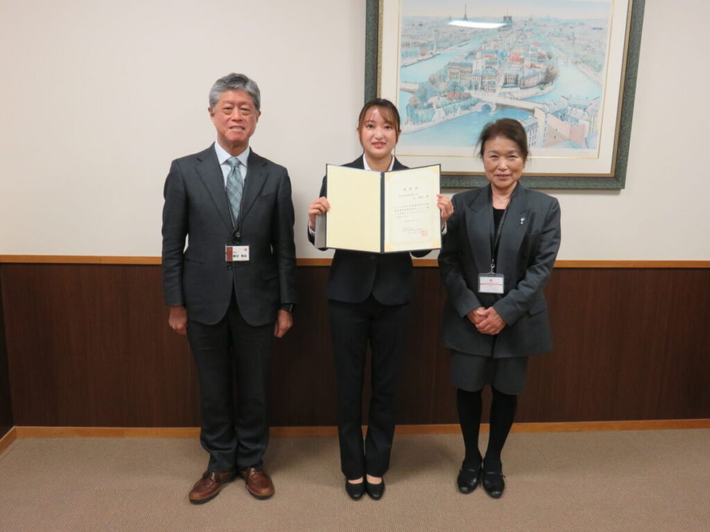 今年度も看護学科4年生1名が表彰規程に基づき推薦され、表彰されることとなりました。 表彰式では、学長から賞状及び記念品が手渡された後、今後も看護医療専門職人として積極的に社会貢献活動に励まれることを期待する言葉が贈られました。