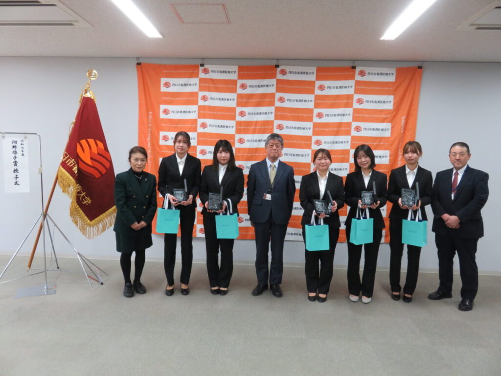 授与式では、学長から賞状(クレストトロフィー)及び副賞が手渡された後、これまでの貢献への感謝と、今後も看護医療専門職人として積極的に社会貢献活動に励まれることを期待する言葉が贈られました。