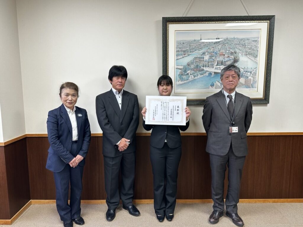 令和7年度 学生表彰について 2026.03.19 その他 このたび、臨床検査学科4年次に在籍する学生が、10月28日に四日市高校周辺における人命救助に協力したとして四日市北消防署から表彰されました。その表彰報告に鑑み、地域社会に貢献奉仕し本学の名誉を高めたとして、本学の規程(学生表彰第4条)に則り、3月17日に学内表彰を行いました。 表彰式では、学長から賞状及び記念品が手渡された後、今後も受賞の名に恥じぬよう、医療人として積極的に社会貢献活動に励まれることを期待する言葉が贈られました。