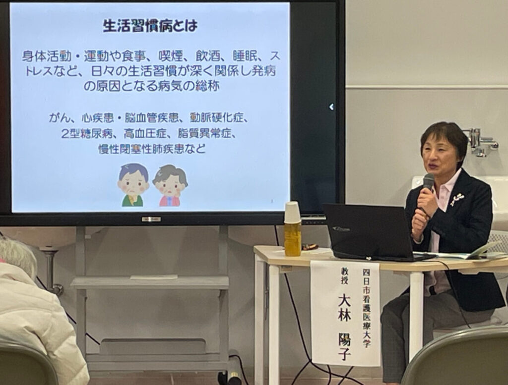 今年度のテーマは「生活習慣を見直して健康寿命をのばしましょう」とし、看護学科 大林陽子教授が講義を行いました。講義では、身体活動・運動や食事など、日々の生活習慣の重要性について解説されました。また参加者の皆様とともに「いきいき健康長寿体操」を実施いたしました。体操では、主に椅子を用い下肢筋力のトレーニングに取り組みました。参加者の皆様からは、「普段使わない筋肉を動かせて良かった」「高齢になると下肢の筋力が重要であることを改めて理解できた」などの感想が寄せられました。